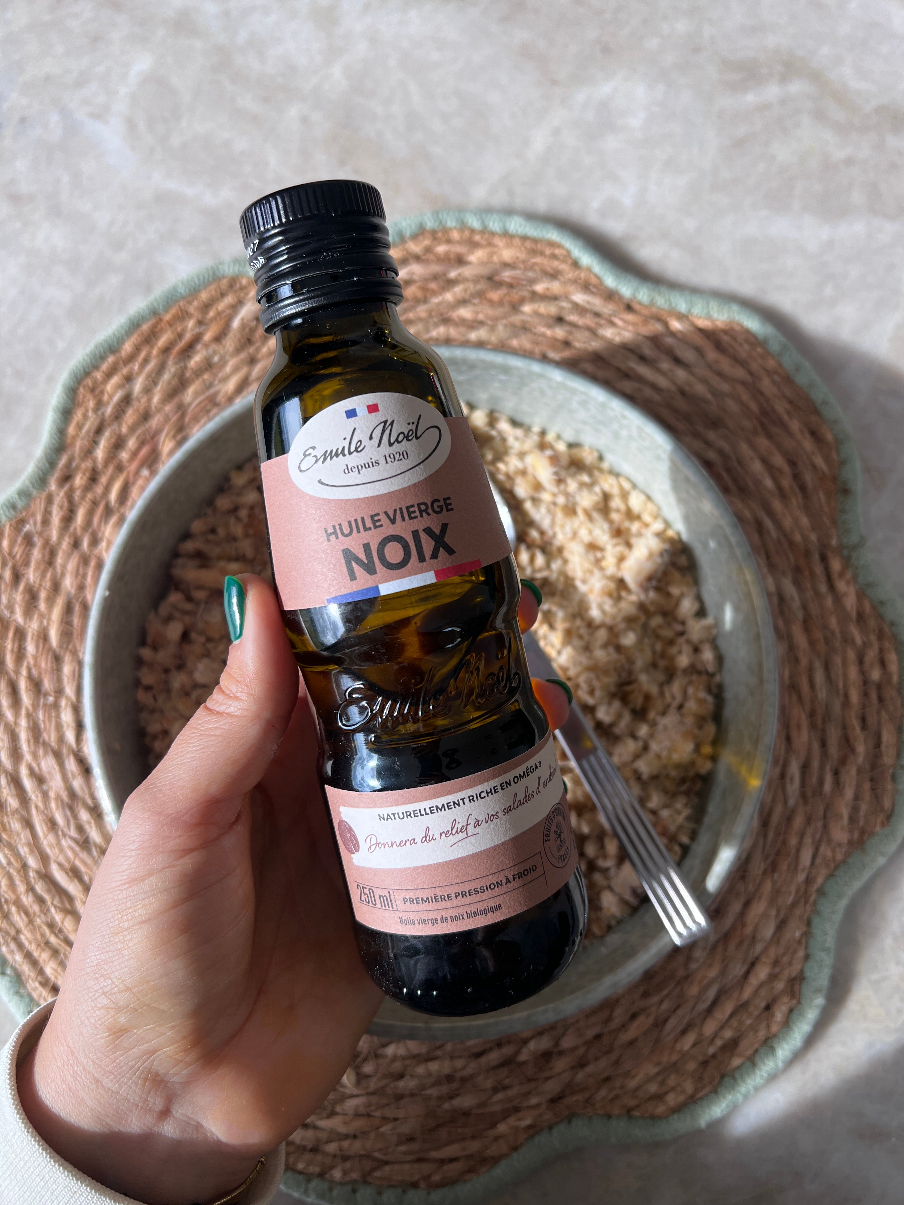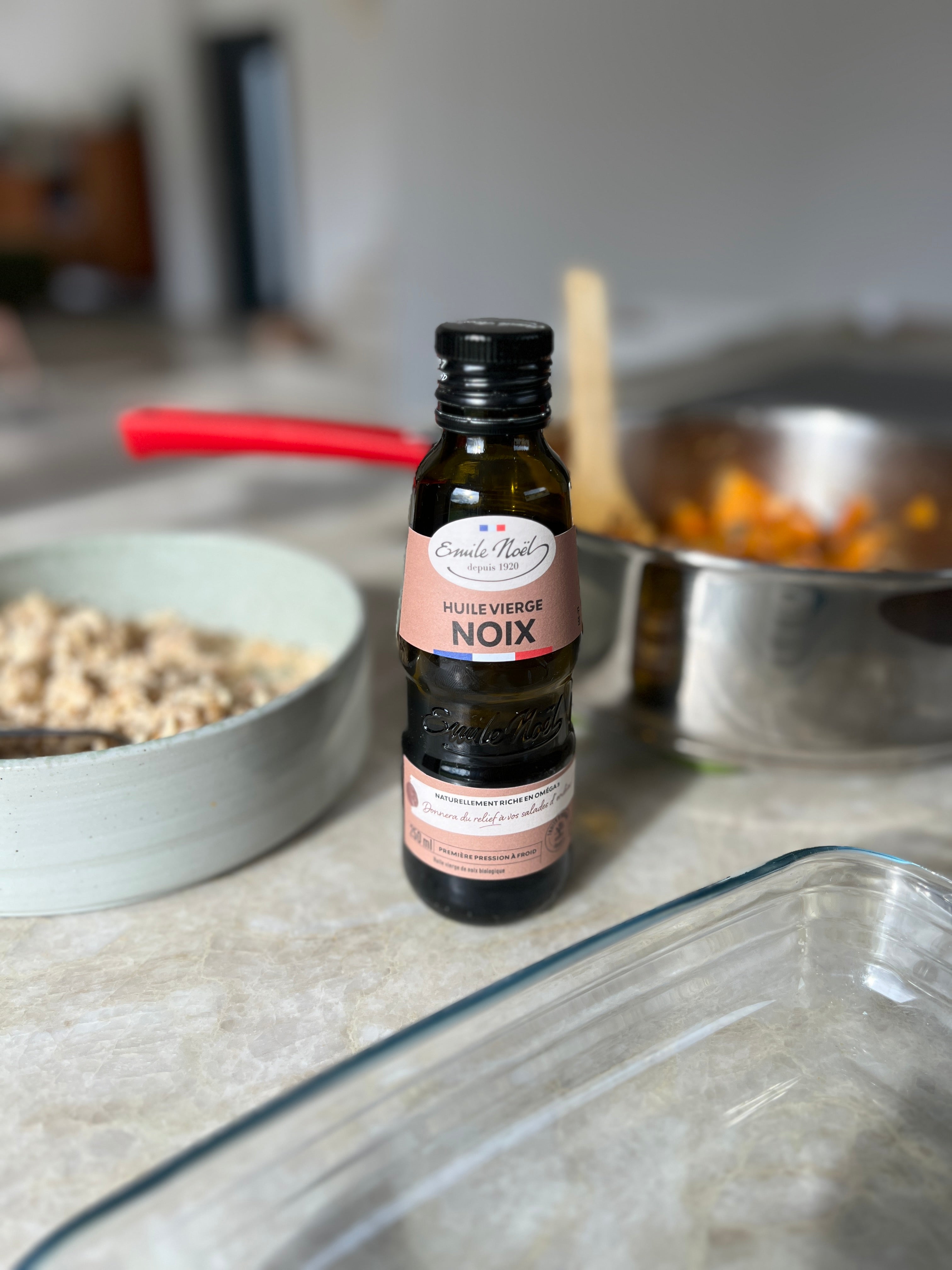 Sublimé par notre huile de noix du Périgord Émile Noël, ce crumble devient un plat chaleureux, parfumé et authentique. Parfait pour réchauffer les journées fraîches. 🍂