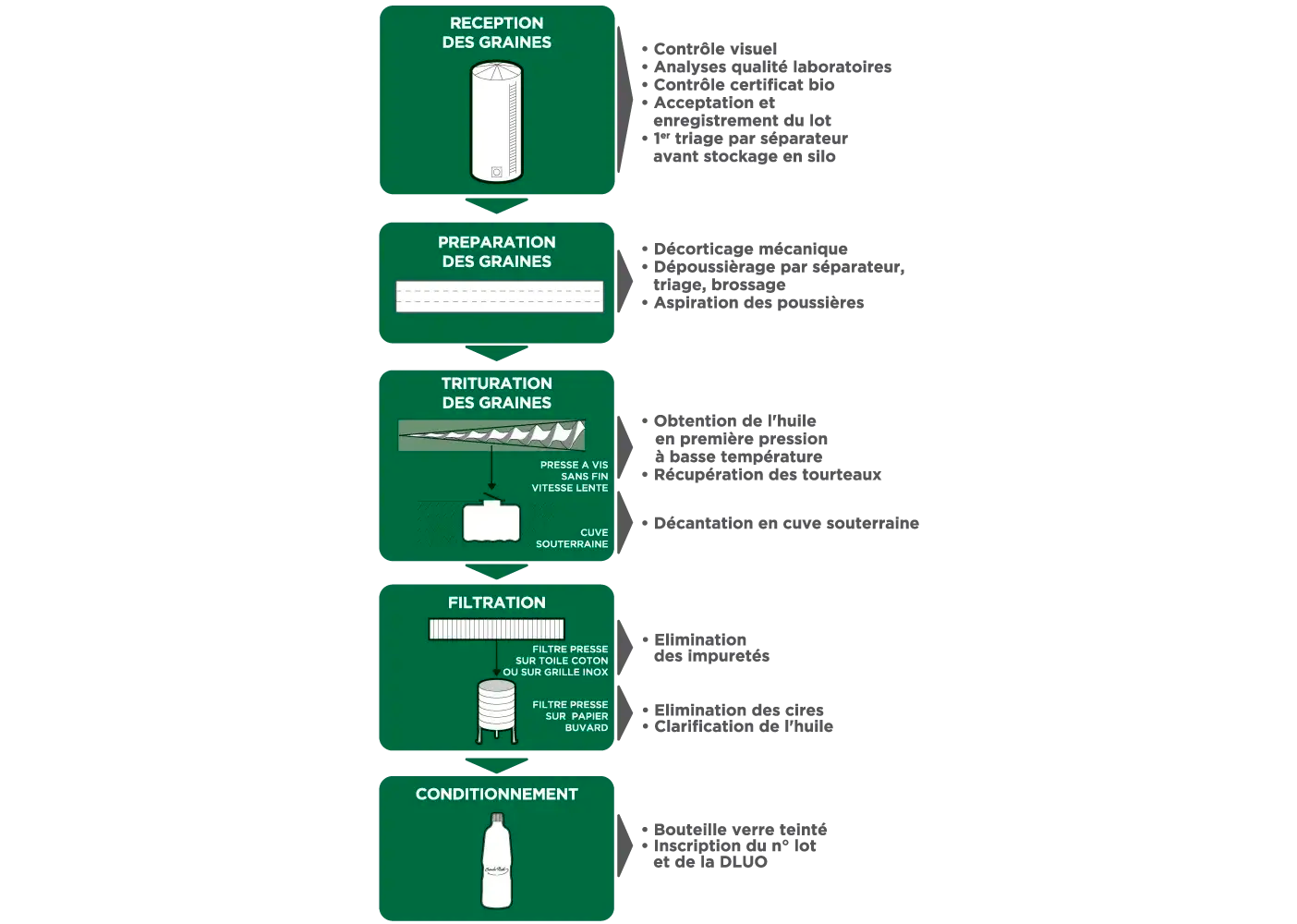 Ce procédé qui est 100 % mécanique et sans ajout, permet de préserver toutes les qualités naturelles des graines : acides gras, vitamines, goût.